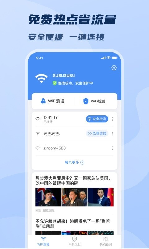 【内存小】高速下载,不占内存,使用边界;节约流量,随时随地畅连优质wifi,拒绝流量消耗担忧;优化后的程序仅占用极小的存储空间,不会影响手机其他应用的运行。