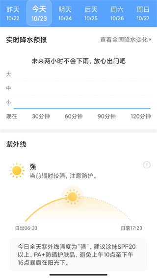 通过APP,用户可以根据个人行程查看每天的天气变化,甚至是之后的7-15天的,方便可以为行程或提前准备。系统支持按小时查看未来天气趋势,并提供穿衣、防晒等生活建议,让出行更有保障。