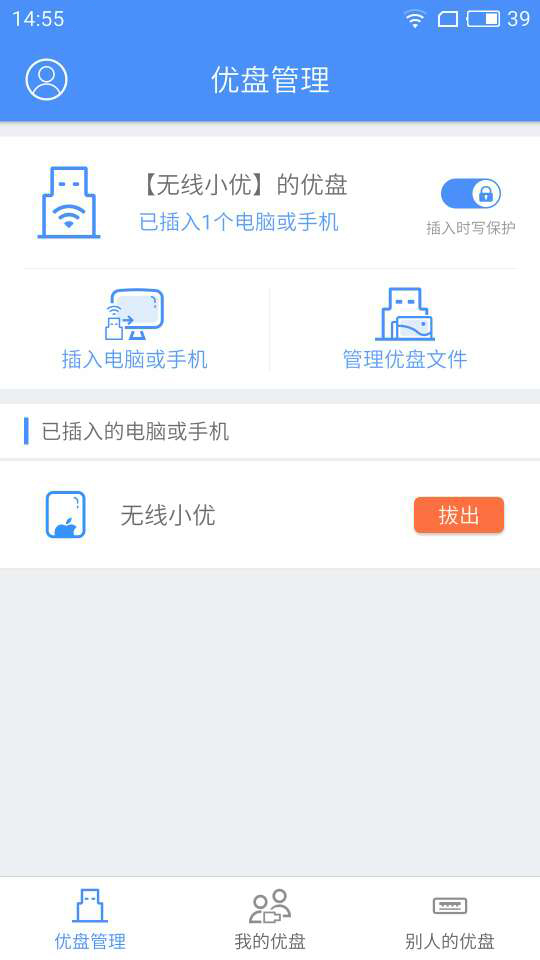 优久优盘连接电脑或手机,一键插入、一键拔出,还可开启写保护防止文件被改动。