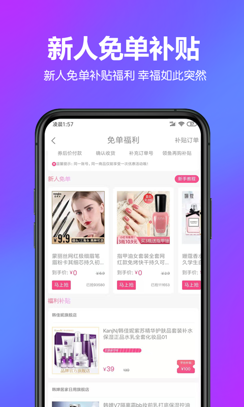 免单福利补贴:新用户注册即可获得专属免单礼包,每日精选多款0元购商品,包含生活用品、零食等实用品类。