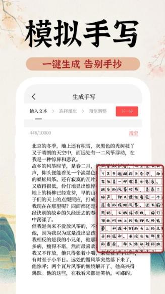操作没有任何的难度,支持用户打字输入或者拍照输入,在最短时间内完成输入,之后生成最真实的模拟手写体。拍照识别功能采用先进OCR技术,准确识别各种印刷体文字,大大提升输入效率。