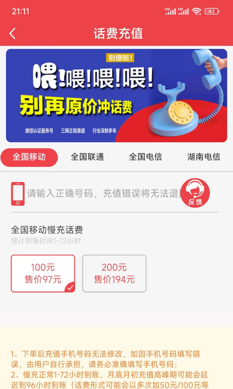 话费充值:支持三大运营商话费直充,到账快且常有折扣