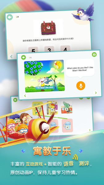 寓教于乐——通过绘本、视频、动画、游戏等丰富的学习形式,趣味闯关、任务挑战、录音配音、语音测评等交互式学习手段,保持孩子的学习热情。平台特别注重培养孩子的学习兴趣,让知识在快乐中传递。