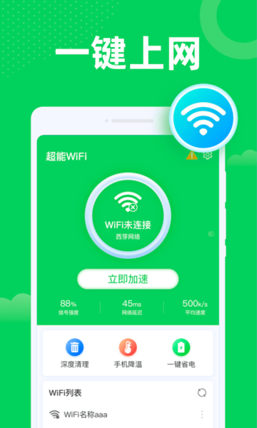 超能WiFi是一款专业的手机网络管理工具,致力于为用户提供全方位的WiFi优化体验。它不仅能够实时监测网络速度,智能优化连接质量,确保流畅的上网体验,还能全面保护您的网络安全。通过先进的检测技术,它可以识别潜在的网络威胁,守护您的隐私数据。同时,这款工具还能精准记录您的流量使用情况,及时提醒套餐余量,并详细展示各应用的流量消耗。此外,内置的手机加速功能可以一键清理内存,提升设备运行效率,让您的手机始终保持最佳状态。