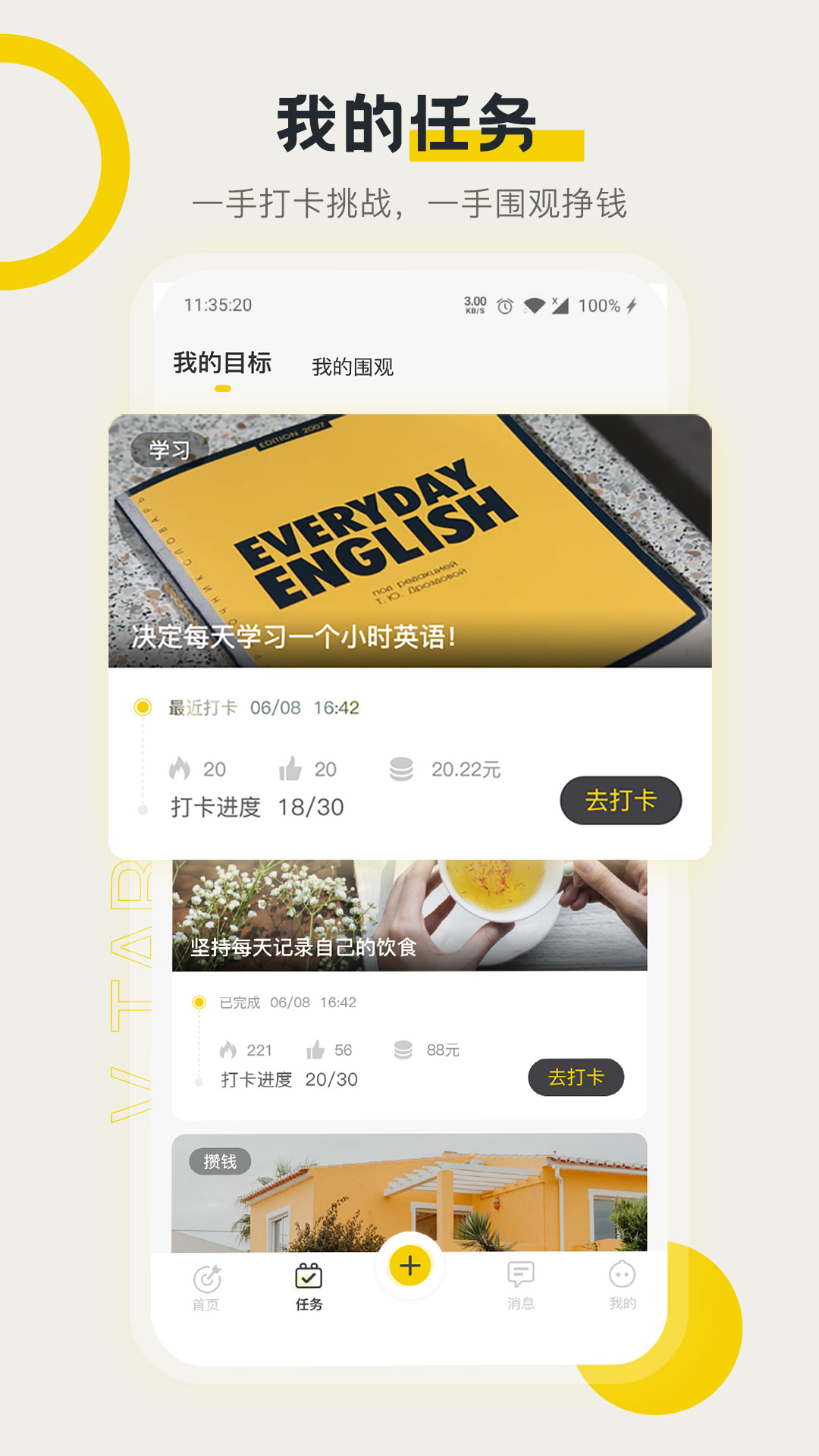 我的任务功能整合了所有目标管理工具。在这里,您可以一手管理自己的打卡挑战,一手参与围观挣钱,实现个人成长与经济收益的双丰收。