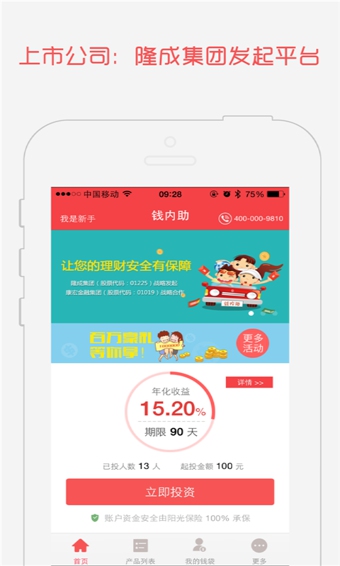 隆成金融集团倾力打造的钱内助平台,致力于为用户提供安全稳健的互联网理财服务。平台依托集团强大的金融背景和丰富的行业资源,构建了完善的风控体系和资金监管机制。通过与多家知名金融机构的战略合作,钱内助为用户打造了一个专业、透明、高效的理财平台,让您的每一分投资都能获得最大程度的保障。