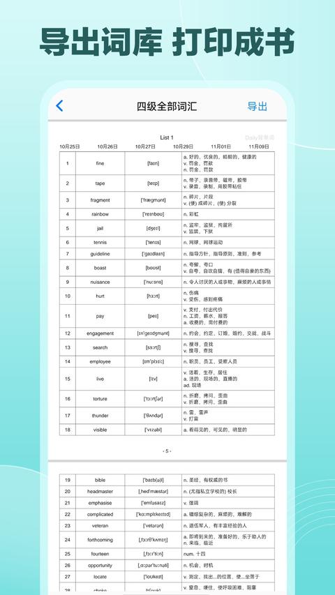 新增了自定义复习周期功能,用户可以根据个人记忆特点调整复习间隔。同时优化了记忆算法,提高了单词记忆的持久性。近期还新增了多项实用功能:支持从外部导入自定义词库,方便专业学习者使用;增加了PDF导出功能,用户可以将单词表导出打印,满足线下学习需求;改进了用户界面,操作更加直观便捷。