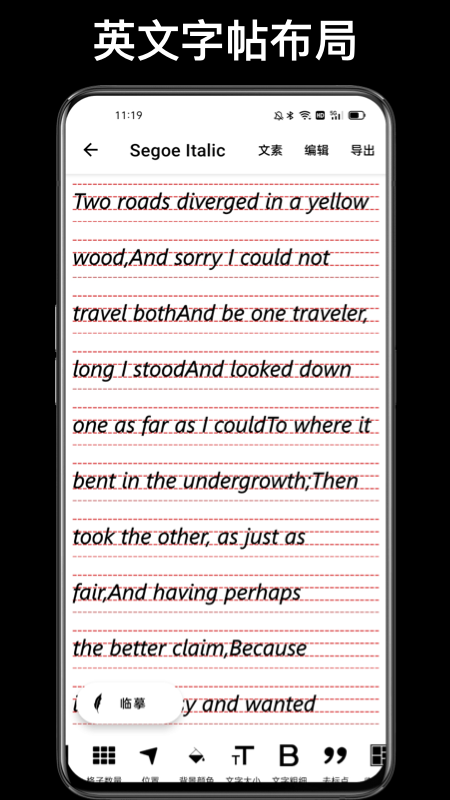 该软件最具特色的是其高度自定义功能。用户可以自由调整文字大小和粗细,满足不同书写工具的需求。标点符号的添加与删除功能让练习更加灵活。实时在线抄写功能支持用手指直接书写,帮助用户掌握正确的笔顺。软件还会记录练习进度,让用户清晰看到自己的进步。多种字体选择功能让用户可以根据个人爱好和练习目标进行针对性训练。
