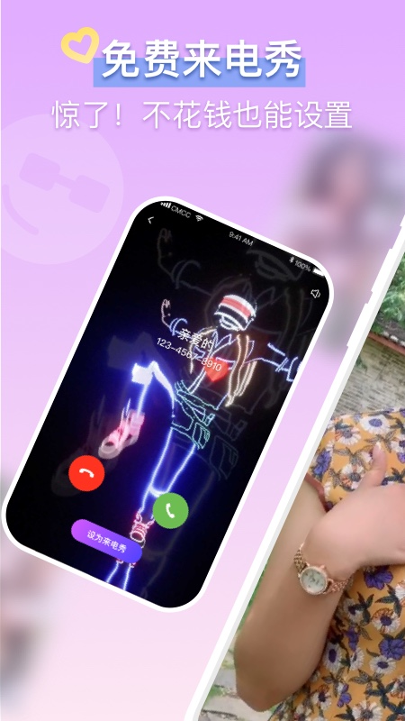 款式多样:提供大量个性化款式供用户选择,让来电更加生动有趣,让您的手机不再单调。从简约商务风到可爱卡通风,应有尽有。每周还会更新最新潮流的来电主题,让您的手机永远走在时尚前沿。