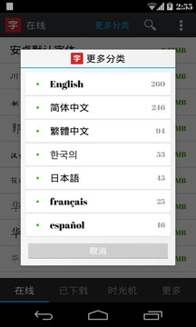 资源丰富:拥有700+款安卓平台最受欢迎的酷炫字体,包括华康少女字体、华康娃娃字体、汉仪系列、书法字体、非主流风格、卖萌字体等,同时支持英语、韩语、繁体中文、日语、法语、西班牙语等多国语言字体。
