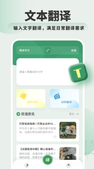每日更新法国最新资讯,让您足不出户就能了解法国文化、时事热点。旅行时遇到的各种标识、菜单都能轻松翻译,解决餐饮、交通等实际问题。特别设计的旅行专题还包含实用小贴士,让您的法国之旅更加顺畅愉快。