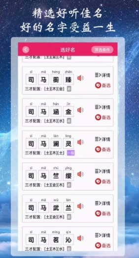 包含有大量的声调选择,用户可以根据个人喜好自由搭配平仄韵律,创造出既好听又有节奏感的名字组合。系统还会自动检测声调搭配是否和谐,避免拗口的情况出现。