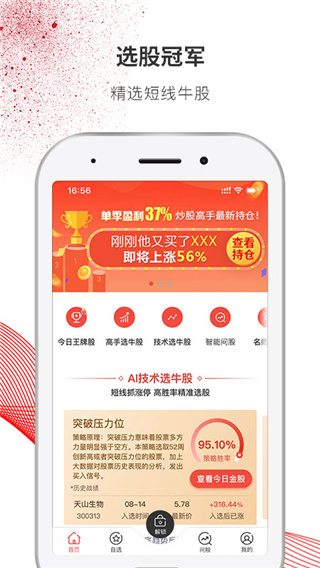 选股冠军app是由上海彼盈信息科技有限公司精心打造的一款专业股票投资辅助工具。该软件依托前沿的大数据分析与人工智能技术,为投资者提供全方位的股市决策支持。通过实时更新的行情数据、精准的股票走势预测以及大资金流向监测,帮助用户快速捕捉市场机遇。软件特别注重挖掘潜力股和热门股,结合民间高手持仓动向分析,为用户筛选出具有竞争力的优质股票。其智能化的选股策略和贴心的交易提醒功能,让投资者能够更加从容地应对复杂多变的证券市场,实现科学投资与稳健收益的完美结合。