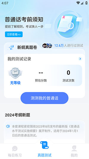 《免费普通话考试》是一款专为普通话水平测试备考设计的手机应用,致力于帮助用户全面提升普通话发音准确性和语言表达能力。该应用整合了丰富的学习资源,包含语音测试、朗读训练、听力理解、口语表达等全方位练习内容,让用户能够随时随地进行模拟考试训练。通过智能化的学习系统,软件不仅提供详细的考试要点解析,还能根据用户的学习进度自动生成个性化复习计划,并设置每日练习提醒功能,确保用户能够科学高效地提升普通话水平,为正式考试做好充分准备。