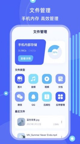 作为一款多功能的手机文件管理工具,它能够帮助用户随时随地高效管理各类文件。软件内置了丰富的功能模块,包括文件分类、批量操作、格式转换等,全方位满足不同用户的需求。无论是解压压缩包、转换PDF文件,还是测量网络速度,都能一键完成。此外,软件占用内存极小,运行流畅,不会影响手机性能。其简洁的界面设计和直观的操作逻辑,让用户能够快速上手,轻松分享文件给他人。