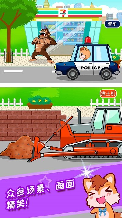 场景体验:警车抓贼,救护车救人,场景有趣真实!让宝宝爱不释手!场景设计融入安全教育元素,在游戏中培养安全意识。