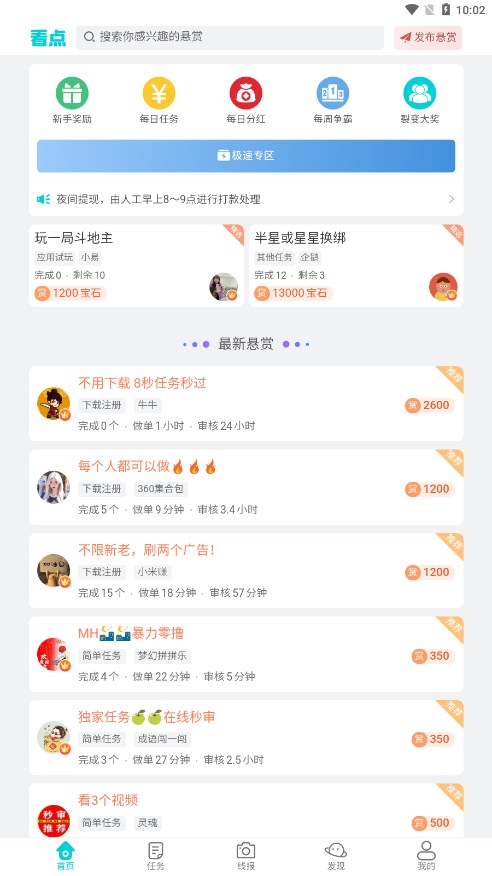 聚多看点app不仅提供丰富的悬赏任务,还为用户准备了多种赚钱福利。首码注册即可享受钻石分红,每日签到还能零撸收益,轻松赚取50元零花钱。平台提现门槛低,2元起提,支持支付宝秒到账,让您的收益快速落袋为安。新手任务更是简单易上手,完成即可领取1元奖励,让您快速体验赚钱的乐趣。此外,平台还提供游戏、线报等多种任务类型,收益高且稳定,满足不同用户的需求。