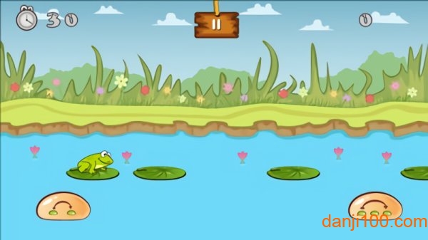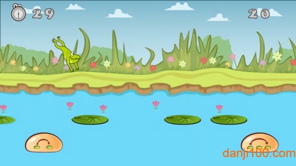 采用卡通风格的河流、青蛙和木桩元素,画面明亮活泼,视觉体验舒适。