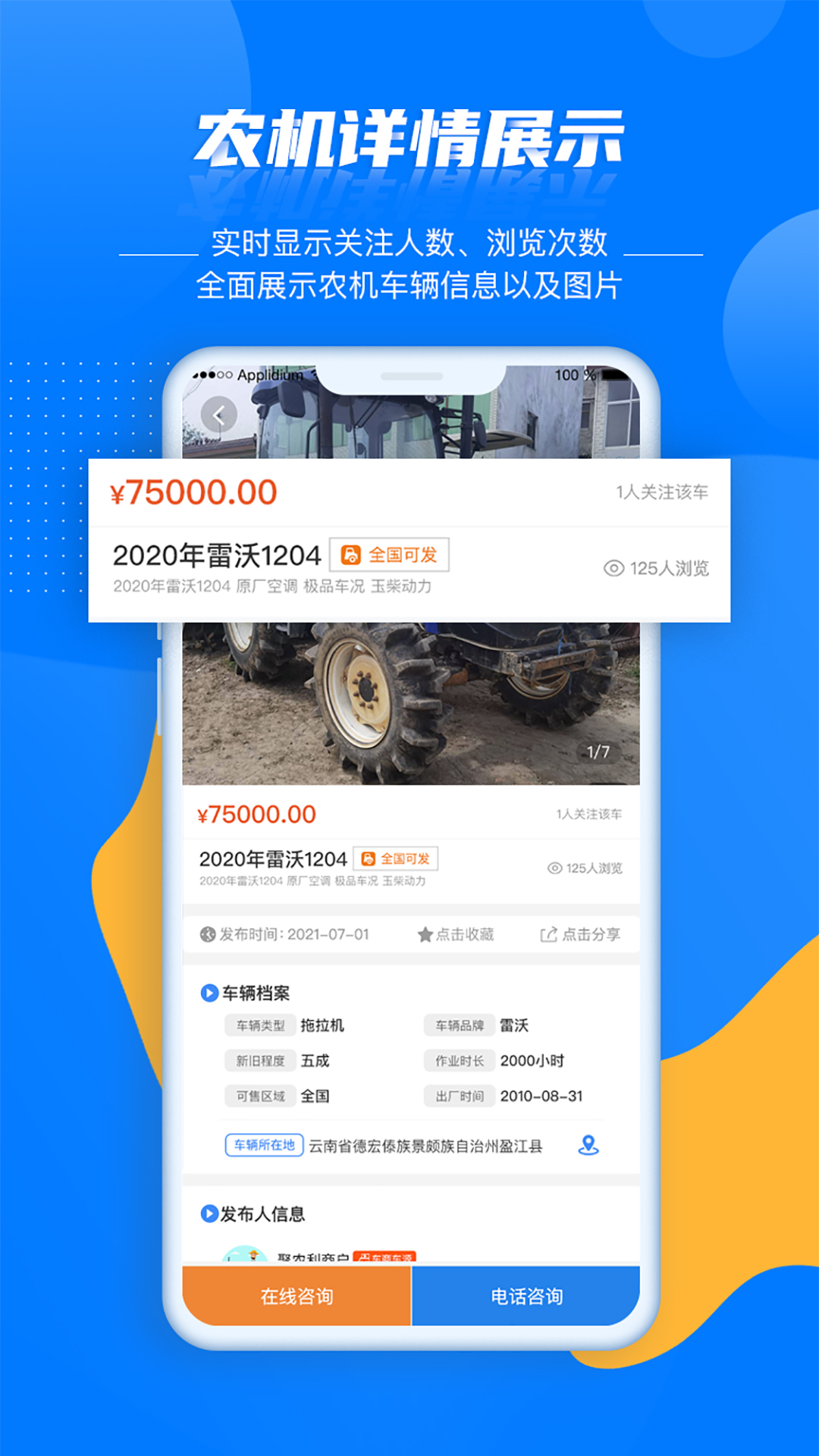 农机详情展示:每台农机设备都有详细的介绍页面,包括车辆信息、使用状况、图片展示等,同时实时显示关注人数和浏览次数,帮助用户更好地了解农机设备的市场热度。