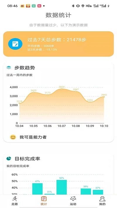 通过软件,用户可以学到很多健康养生知识,科学规划自己的健身,让健身不再盲目,而是充满科技感,软件会定期推送专业的健身指导和营养建议。为用户提供多种健身模式,不仅包括室内跑步,还包括步行、登山、徒步等,健身模式多种多样,让用户充满健身乐趣,每种模式都有专属的数据分析。可以设定短期目标或长期目标,可以帮助用户实时监控,及时提醒用户目标完成情况,给予用户更大的健身动力,目标达成后还会有成就奖励。