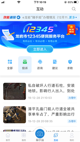 最后是创新的政民互动机制。在传统12345服务热线的基础上,平台推出"随手拍"功能,实现电话、电脑、移动端全渠道覆盖。市民可以随时咨询问题、反映诉求、提出建议,政府部门则会快速响应处理,形成良性互动,持续提升行政服务水平。