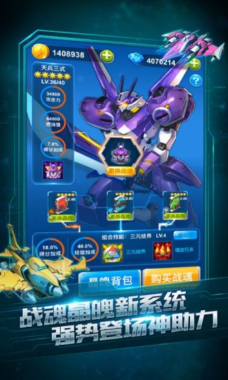 2. 战机养成系统:包含六大属性机型(速攻型、防御型、暴击型等),通过消耗金币升级火力、装甲与特殊技能。每架战机拥有专属被动天赋树,例如散射弹幕、护盾再生或击杀回血,需根据关卡特性灵活切换。