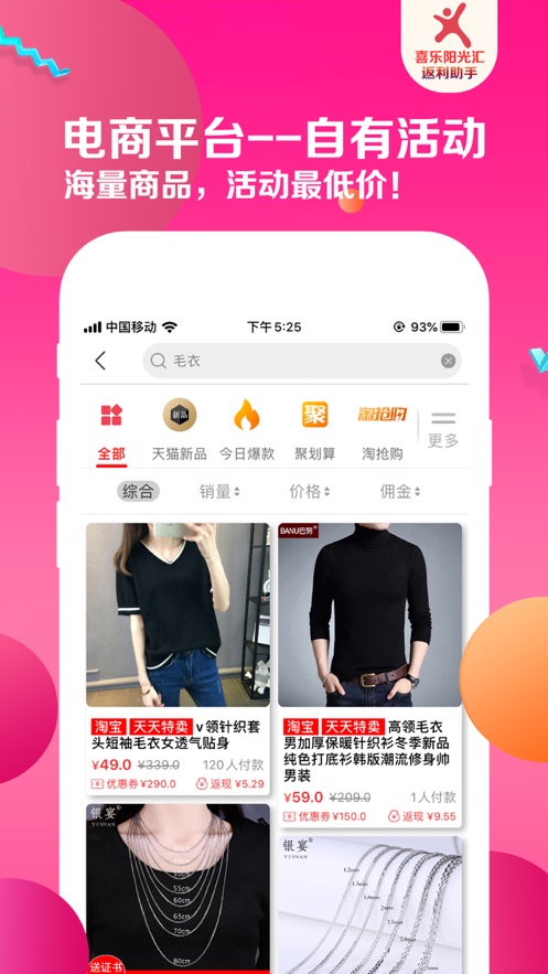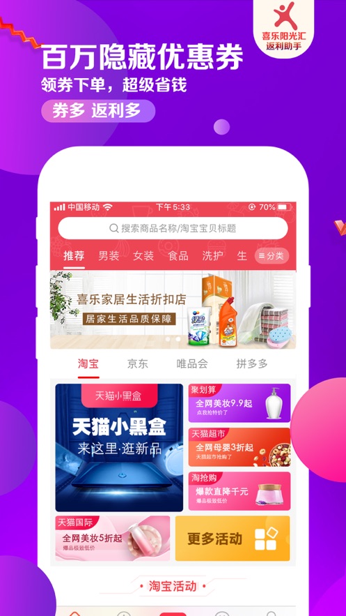 百万隐藏优惠券任你领取,下单即可享受超值折扣,券多返利多,让你的每一分钱都花在刀刃上。软件还拥有自有活动专区,提供海量商品的最低价促销,让你轻松买到物美价廉的好货。此外,喜乐排行app还是一款贴心的购省钱小助手,支持淘宝、京东、唯品会等主流电商平台的购物返利,最高返利可达80%,让你的网购更加实惠。