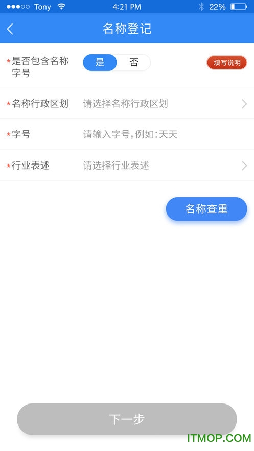 第三步:个体工商户设立分为已核名和直接申请两种方式。系统提供智能名称查重功能,避免名称重复问题,同时支持无名称字号申请,满足不同用户需求。