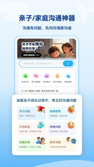 海豚沟通APP是一款集儿童启蒙教育与亲子沟通指导于一体的优质应用。它不仅提供了丰富的学习资源,还融入了科学的家庭教育理念,帮助家长掌握正确的教育方法。通过生动有趣的内容和互动方式,让孩子在快乐中学习成长,同时增进亲子感情。这款应用致力于为每个家庭打造温馨和谐的教育环境,是3至12岁儿童家庭教育的理想选择。下载使用海豚沟通,让孩子的成长之路充满欢乐与收获,为家庭带来更多幸福的亲子时光。