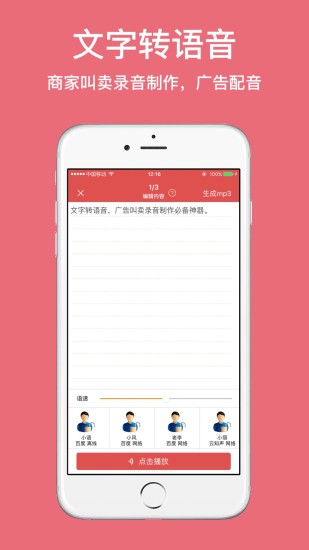 广告配音:专业级的商场广告、地摊叫卖配音功能,支持音量、语速调节,让您的宣传更具吸引力。