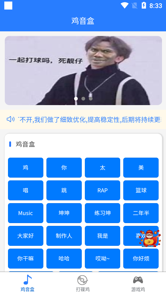 《鸡音盒》是一款由知名游戏开发团队精心打造的音乐策略游戏。游戏中,玩家将扮演一只可爱的鸡,通过收集音符、完成节奏挑战来解锁更多关卡和音乐曲目。游戏的核心玩法是将音乐节奏与策略操作相结合,玩家需要在正确的时间点击屏幕,同时避开障碍物和敌人。游戏提供了丰富的音乐曲库,涵盖流行、古典、电子等多种风格,满足不同玩家的音乐偏好。此外,游戏还支持多人合作模式,玩家可以与好友组队,共同挑战高难度关卡,体验音乐与策略的双重乐趣。精美的画面设计、流畅的操作体验以及多样化的游戏内容,让《鸡音盒》成为一款适合所有年龄段的休闲游戏。