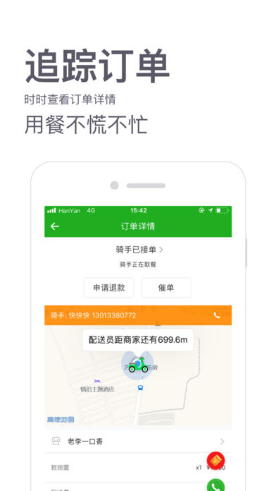 配送状态实时掌控,从容用餐,与排队说再见,地图轨迹功能让您清晰掌握骑手位置,合理安排用餐时间。