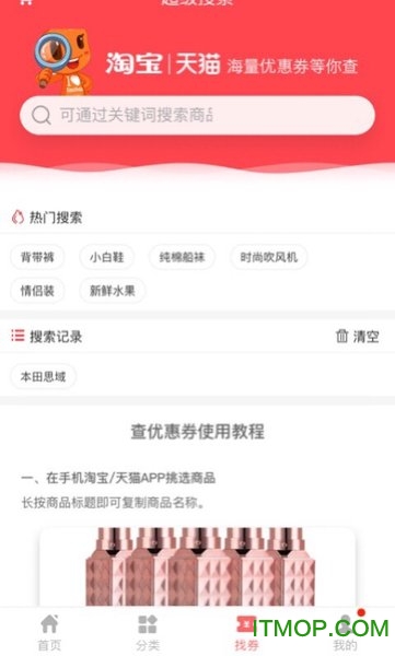 第二步:进入首页后,可通过搜索框输入商品关键词或直接浏览分类查找优惠券;