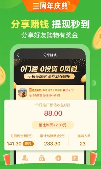 无需任何投入和成本,只需通过APP分享优惠信息给好友,就能轻松赚取丰厚佣金。这种创新的社交裂变模式让赚钱变得简单有趣,真正实现躺着也能赚钱的梦想。