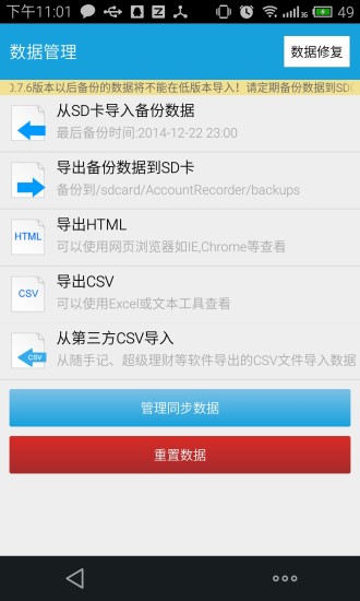 修复了若干界面显示异常问题,优化了应用在不同分辨率设备上的适配性。增强了数据同步机制的稳定性,减少意外中断情况。将同步提醒周期延长至7天,避免频繁通知干扰。新增账目清单导出功能,支持CSV和HTML格式,方便用户进行深度财务分析。此外还对多项细节进行优化,如改进分类标签管理、提升历史记录加载速度等,全方位提升用户体验。