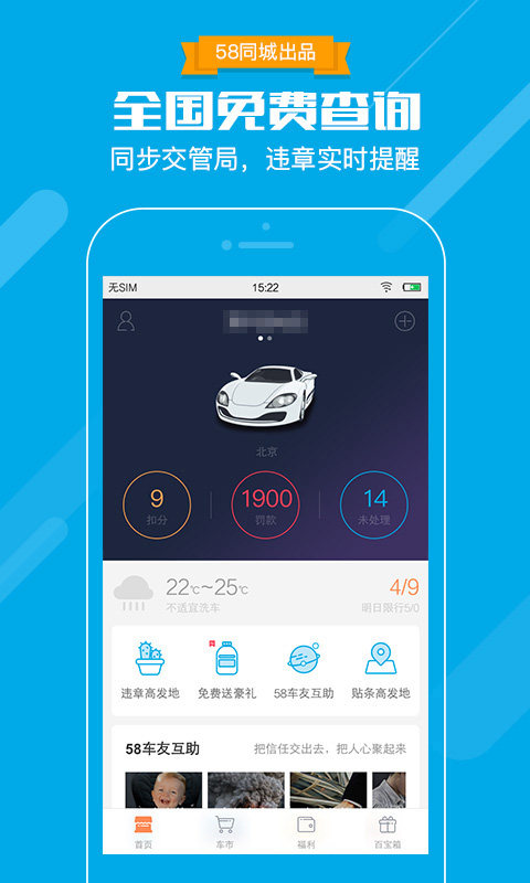 新违章、限号主动提醒功能让您第一时间掌握违章信息;支持多车管理和异地查询,满足不同车主需求;北京、深圳地区已开通违章缴费服务,更多城市正在陆续接入。每日更新的天气和洗车指数为您的出行提供参考;周边加油站、停车场一键查询功能让用车更便捷。百宝箱整合了4S店、洗车、养车等多项服务,还有丰富的车主资讯和不定期的优惠活动,全方位满足车主需求。