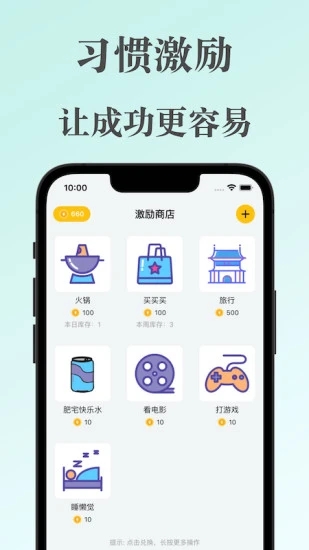 软件附带的激励系统,可以帮你更好的达成习惯养成目标。支持社交分享功能,邀请好友互相监督,形成良性竞争氛围,让坚持不再孤单。