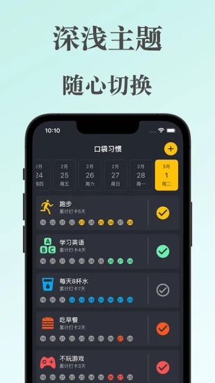 口袋习惯设计简洁,轻松一点,即可完成打卡,还有丰富的统计追踪系统;支持Apple Health等健康数据同步,自动记录运动、睡眠等健康指标,形成完整的生活画像。