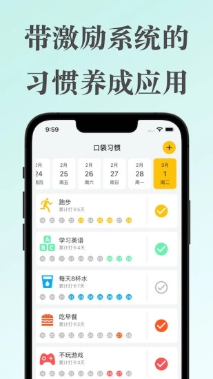 让你对于自己制定的目标还有多久才能完成看的一目了然。独创的"习惯进度条"直观显示完成度,配合语音鼓励功能,在关键时刻给予正向强化。