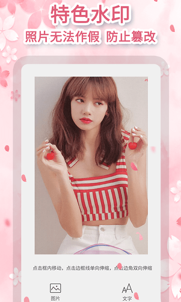 图片加水印:可以添加自定义相册图片,自定义文字,自由涂鸦,多图层想怎么玩就怎么玩。支持多种字体样式和透明度调节,打造专属水印效果。