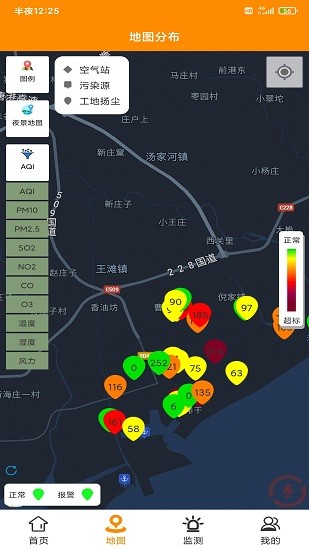 查看地区实时空气质量变化地图模式AQI超标标识。