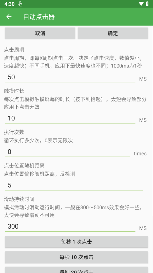 在设置界面中可以详细配置点击参数,包括点击频率、持续时间和执行次数等。建议将时长设置为最大值,执行次数设为0以实现无限循环。