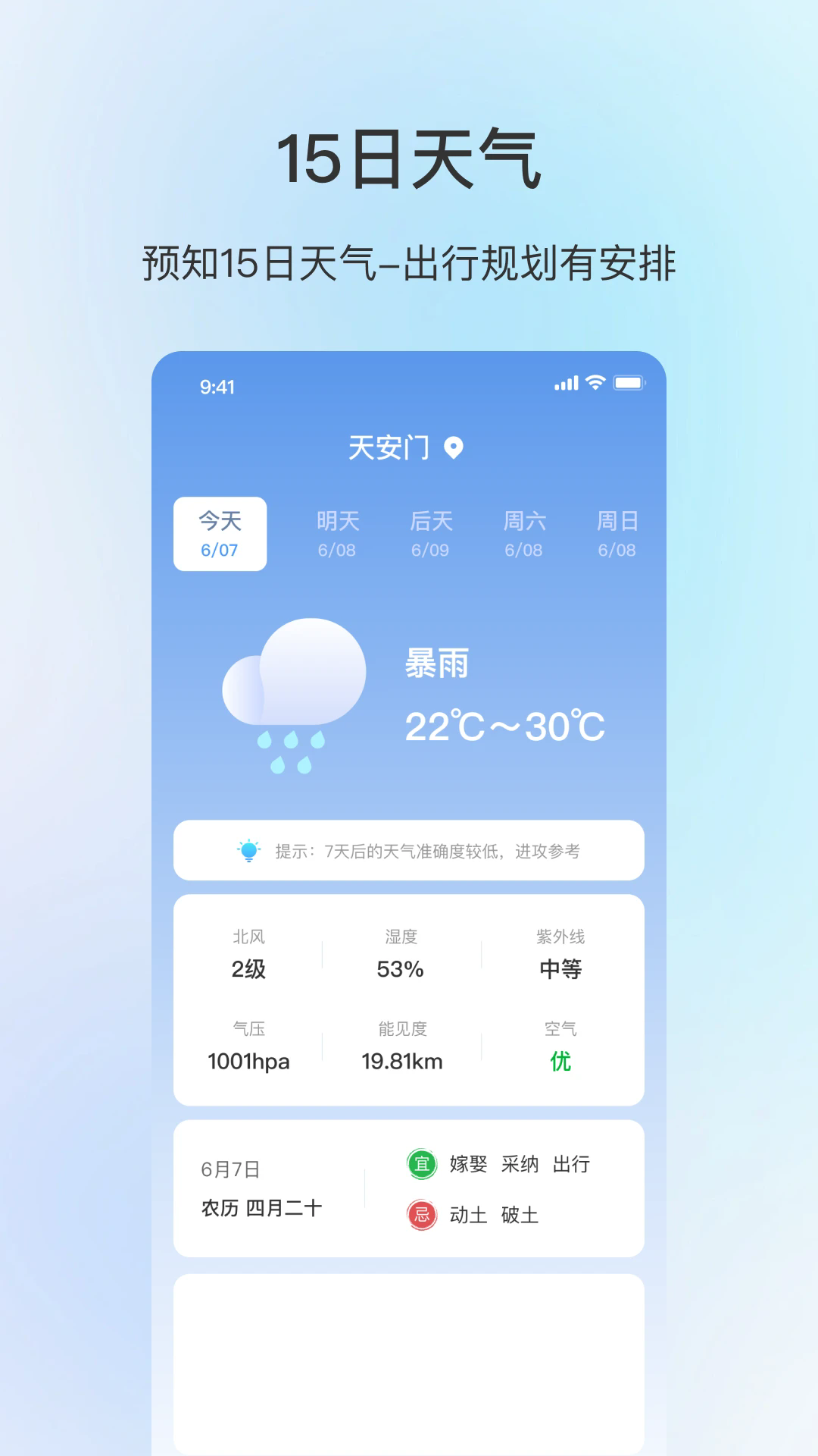 【15日天气】提前预知15日天气、风向、日出日落时间、紫外线、气压、空气质量、黄历宜忌、节日节气;特别适合旅行规划和长期活动安排。