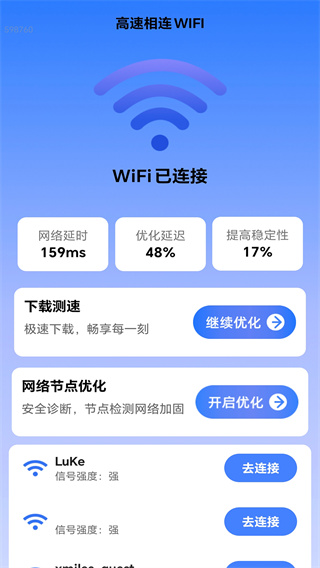 使用《高速相连WiFi》非常简单。首先打开应用,系统会自动扫描并显示附近所有可连接的WiFi热点。用户只需点击选择想要连接的网络名称,应用就会智能完成连接过程。连接成功后,建议点击"安全体检"按钮,系统将对当前WiFi网络进行全面安全检查,包括检测是否存在ARP欺骗、DNS劫持等常见网络安全问题。此外,用户还可以在设置中开启自动连接功能,让应用在检测到更优质网络时自动切换,确保始终获得最佳网络体验。