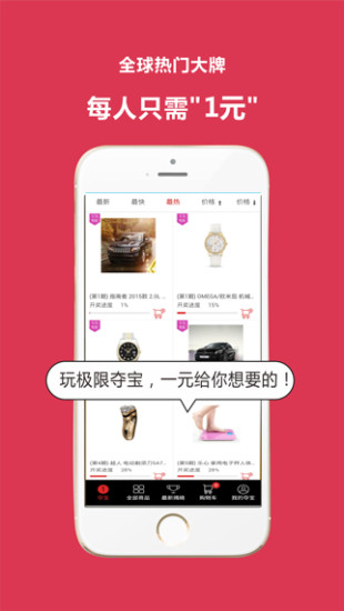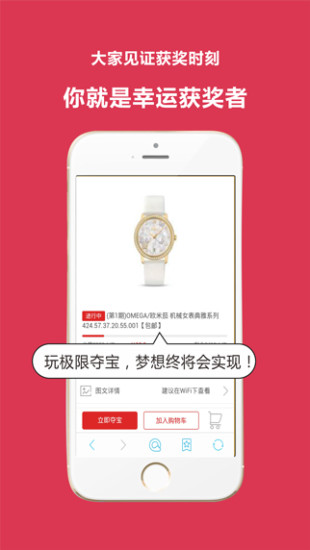 在极限夺宝,一元零钱,也许就能得到你梦想的豪车,手机,平板,名表,全球各大品牌奢侈品应有尽有。