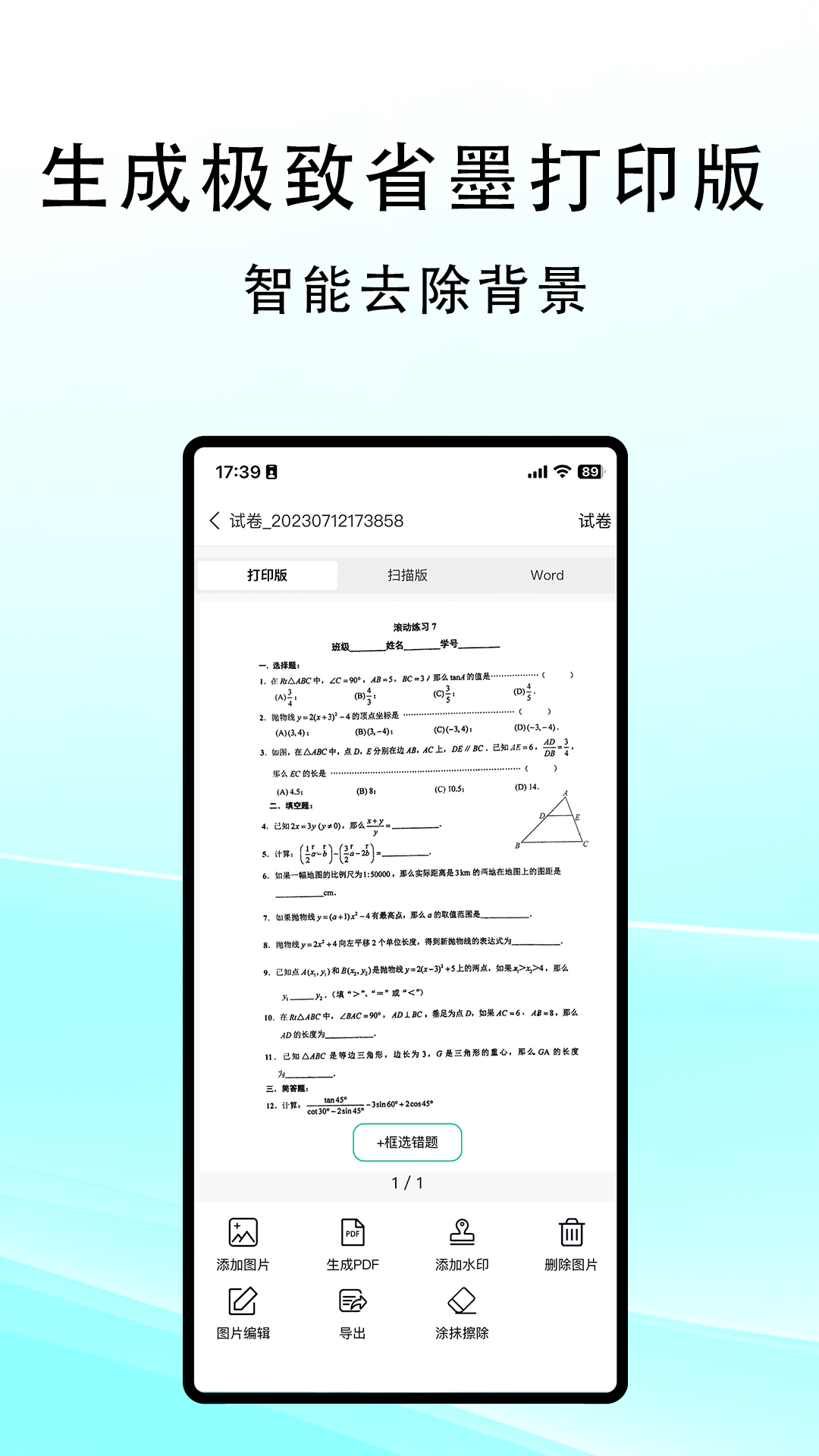 【图片转WORD】功能能够智能还原原始版面,保持文档格式的一致性,让转换后的文件与原件几乎无异。【随身扫描仪】功能通过一键拍照即可智能去除手写痕迹和杂乱背景,生成高清的扫描件,随时随地满足用户的扫描需求。【省墨打印】功能可以智能优化文档背景,生成适合打印的版本,帮助用户节省墨水消耗,实现环保节能的打印体验。