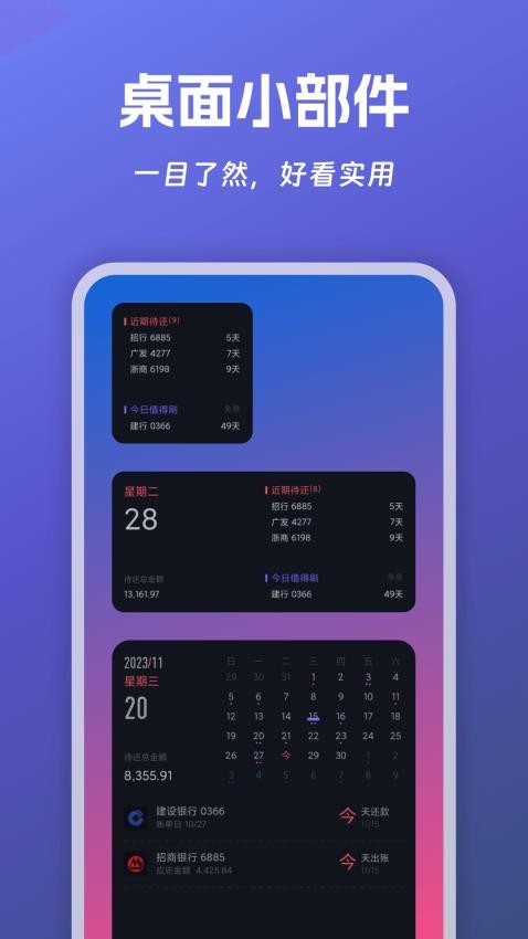 方便实用:功能丰富,操作简单易懂,轻松管理多张银行卡,让您的银行卡消费安心放心。无论是信用卡还是储蓄卡,都能一站式管理,让繁琐的金融事务变得简单高效。