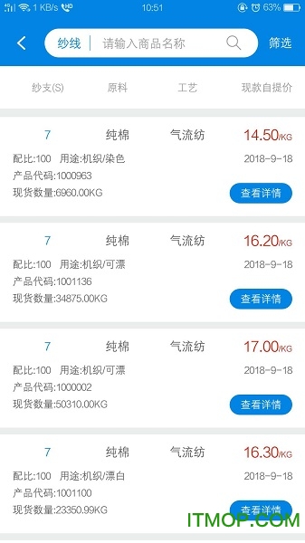 涵盖7S到100S全系列纱线产品,包括纯棉纱、涤棉纱、弹力纱、莱赛尔、粘胶纱等多种品类,价格透明,参数详尽。
