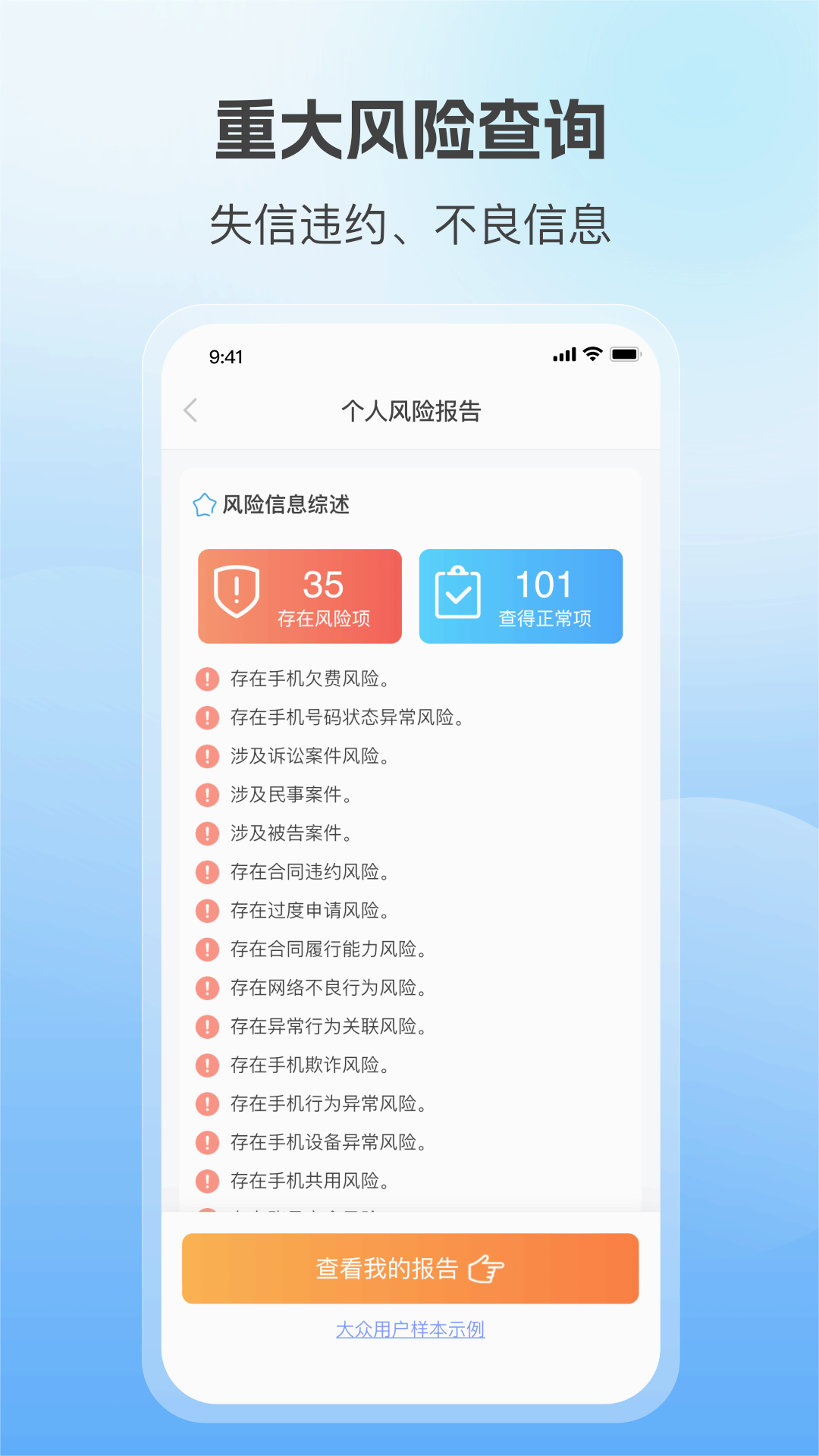 让用户在线快速查询个人风险报告,及时全面掌握自身的信誉状况。查询结果支持导出分享,方便用于求职、贷款等各类场景。