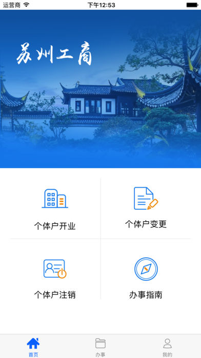 "苏州个体登记手机通APP"包含"首页"、"办事"、"我的"三大部分。其中"首页"包括"个体户开业"、"个体户变更"、"个体户注销"、"办事指南"四个模块,目前正式上线的有"个体户开业"和"办事指南"。申请人点击"办事指南",可以查看个体工商户登记办理流程、依据、时限等内容;点击"个体户开业",可以直接在相应的空白处填入登记信息,待操作正确会有"提交成功"的提示语,工作人员将在1个工作日内受理、受理后1个工作日内给出审核结果。申请人可以在"我的"模块中查看办理结果。